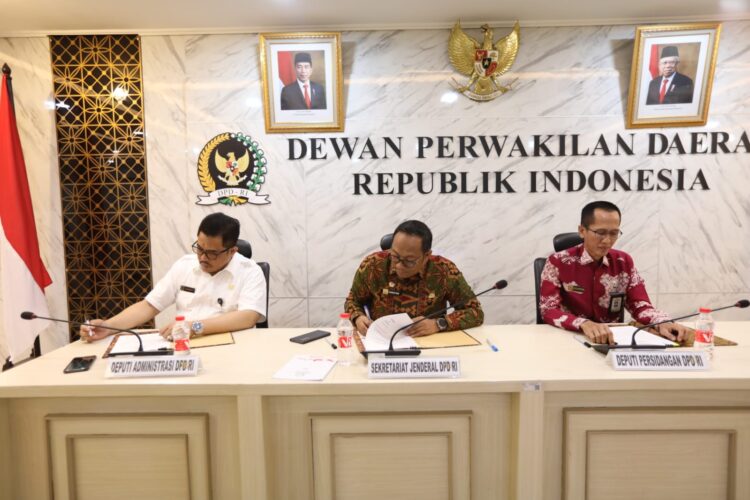 URBANCITY.CO.ID – Sekretaris Jenderal DPD RI Rahman Hadi bersama Deputi Bidang Administrasi Lalu Niqman Zahir dan Deputi Bidang Persidangan Oni Choiruddin memimpin penandatanganan Perjanjian Kinerja Sekretariat Jenderal (Setjen) DPD RI tahun 2024 di DPD RI, Selasa (19/12/2023).